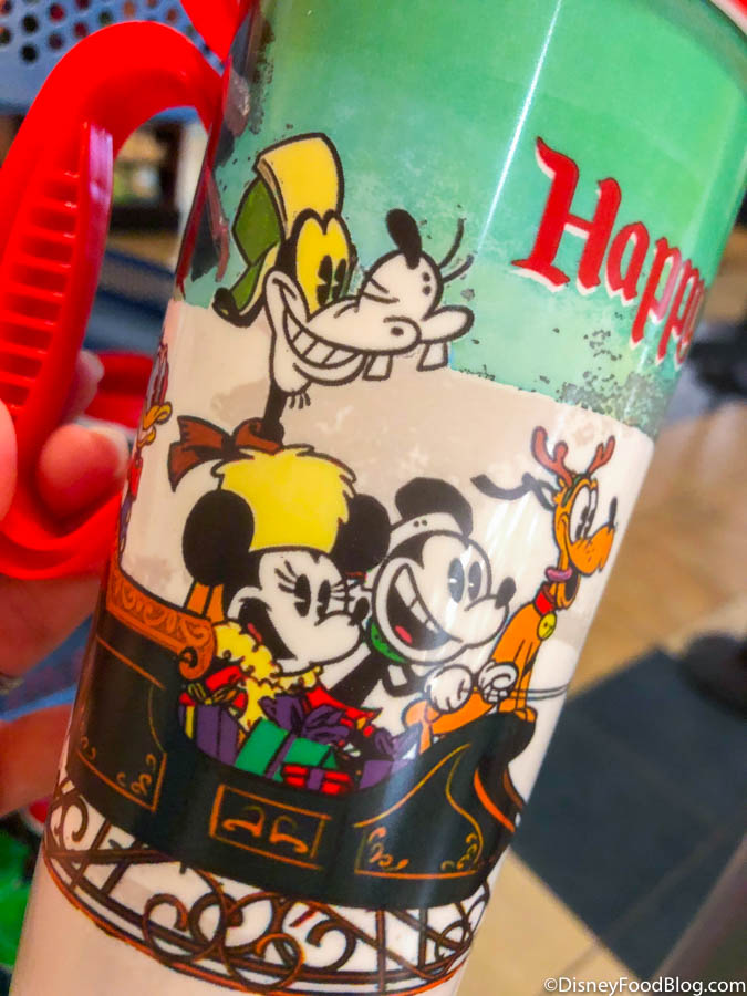 Sticking with the theme from the “Happy Holidays” Popcorn Bucket we spotted in Magic Kingdom, the mug features the new Mickey and friends cartoon style and a red handle and lid.