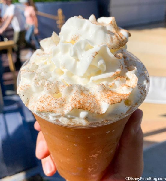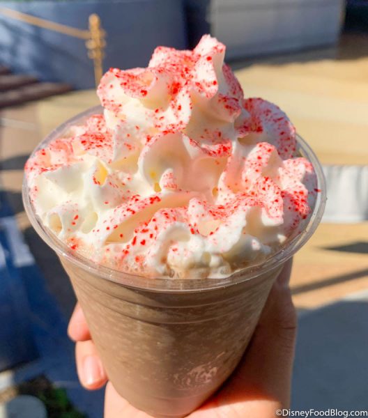 Let’s take a look at those slushes! We’re always excited to see a new coffee offering in the parks because in Disney, a coffee pick-me-up can do WONDERS when you’ve been running around all day! So, we gave the Nova Coffee Slush a try for $5.49 first! This drink is made with coffee and flavored with chocolate and mint. It’s also got a good mound of whipped cream on top that is dusted with peppermint flakes.