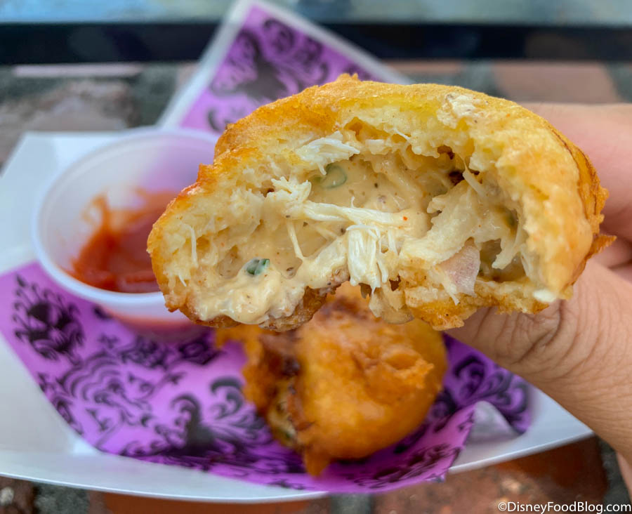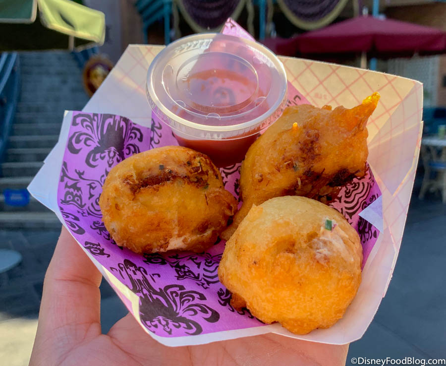 While the fritters were soooo good on their own, the mild cocktail sauce cranks them to the next level. The slightly sweet sauce pairs perfectly with the cream cheese and the crab, tying the whole dish together. For real, we’ve never finished a snack so fast in the parks before!! 🙂
