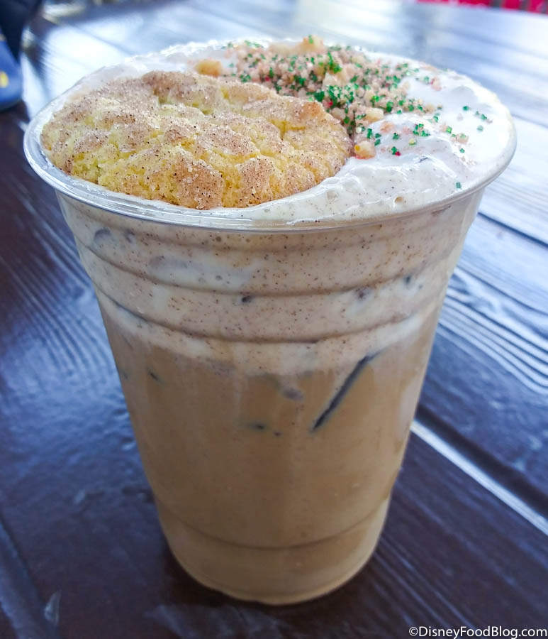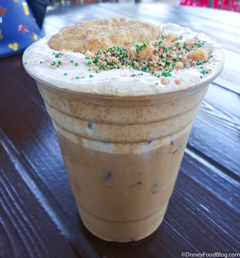 This drink is actually a delightfully different Christmas drink compared to others we’ve seen in the parks! The cold brew has a smooth, full-bodied, and rich flavor that kept us sipping away. The snickerdoodle foam cream is sweet and cinnamon-y, so you could taste it with every bite. The mini snickerdoodle cookie, cookie crumbles, and sprinkles add some extra chewiness and crunchiness to the drink that we LOVED. Seriously, if you’re a coffee-lover, this holiday treat is the perfect way to start Christmas off right!!