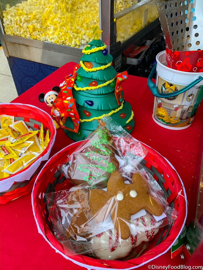 They also carry an assortment of pre-packaged Gingerbread and Holidays Sugar Cookies as well as bottled Dasani water and Coke products. AND the must-have souvenir of the season — the Mickey Christmas Tree popcorn bucket!