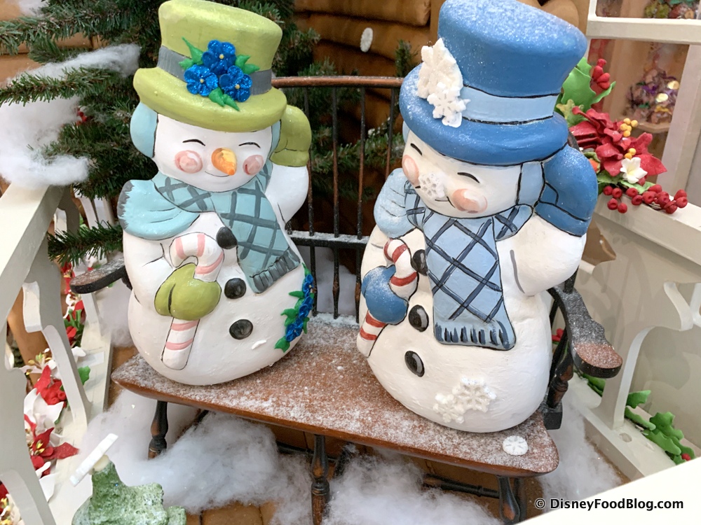 These little snowmen wearing hats and scarves on the gingerbread house’s wrap-around porch really caught our eye!