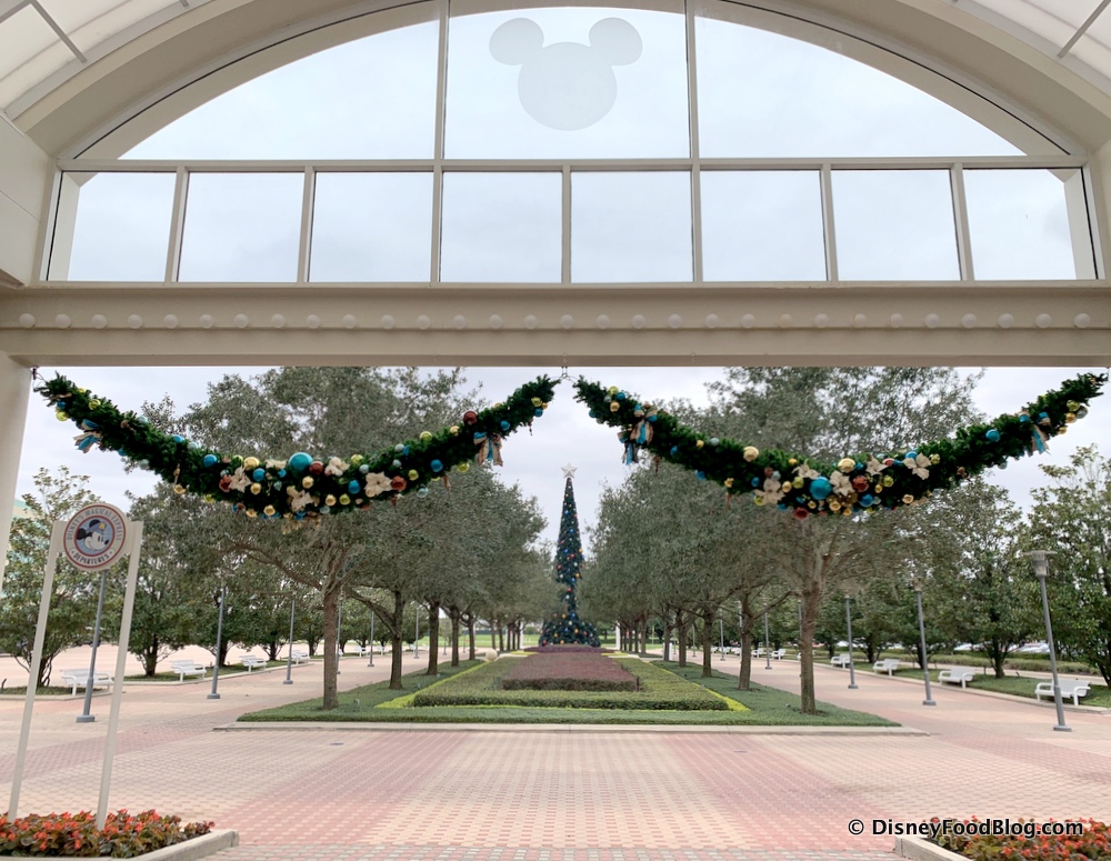 Festive swags of garland are now hanging above the Guest Services counter in the lobby of Disney’s Contemporary Resort, and the entranceway was also looking especially merry and bright with its own seasonal treatment!