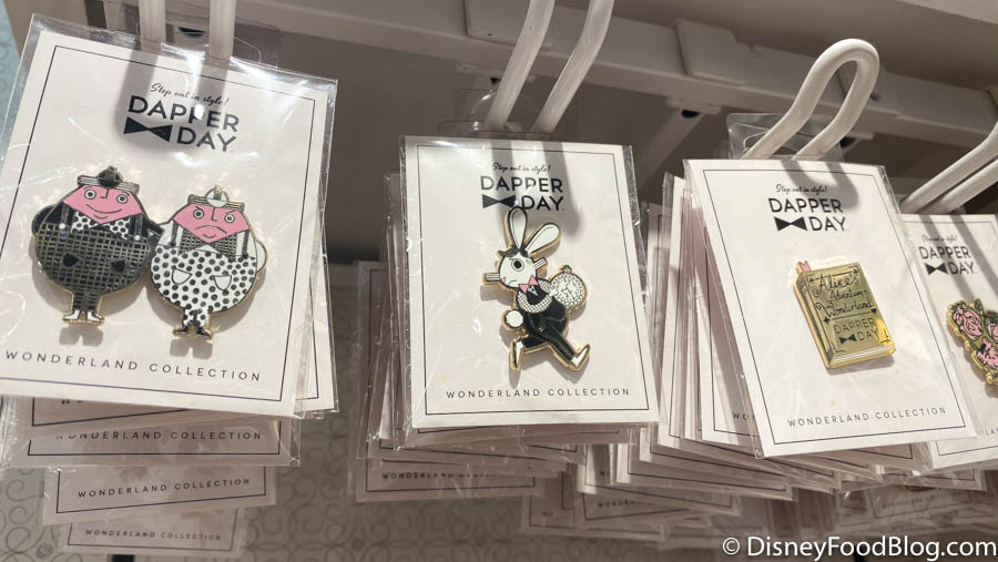 And what would a Disney Dapper Day be without a little bit of Disney magic? The Dapper Day Wonderland Collection offers some very fun Alice in Wonderland-inspired merch, including these amazing pins!