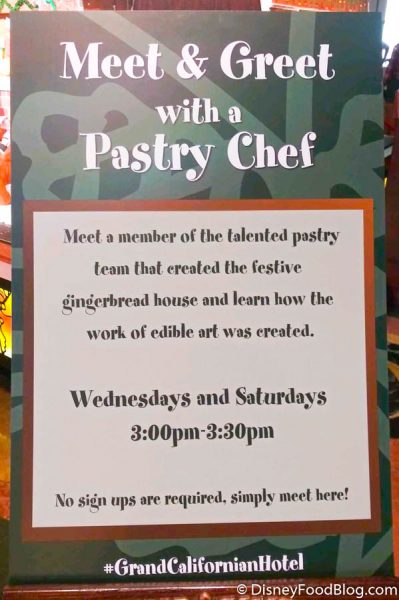 If you’re lovin’ the gingerbread house at Grand Californian, there’s a couple special events so that you can get in on the confectionery fun for yourself! Sign up to build your own Gingerbread House with all the necessary supplies (ingredients?) and some bonus gifts to take home! This event occurs throughout late November and December and is $70 per person.
