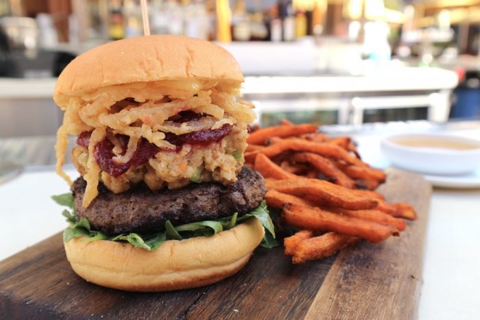 The burger is topped with angus beef (no turkey here, folks!), arugula, cornbread stuffing, cranberry sauce, garlic aioli, and crispy onion strings. It comes with a side of sweet potato fries (!!!) and gravy to finish off your Thanksgiving feast!