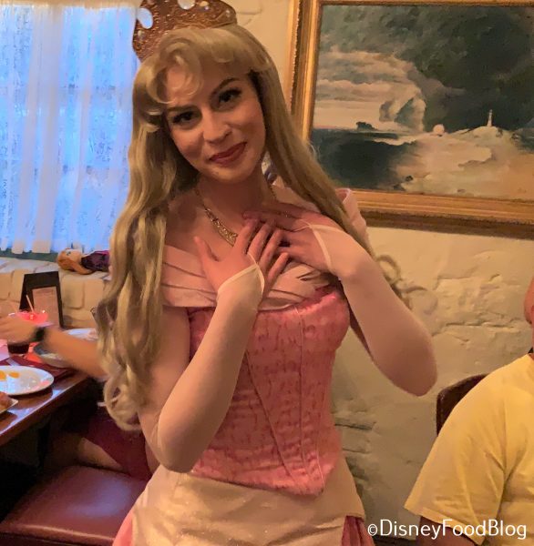 Before being escorted to your table, it’s time for your first royal greeting! Typically, Belle is there in her lovely evening gown to say hello! (Sometimes at Christmas time she’s in her holiday gown which is TO DIE FOR.) Keep in mind, the visiting princesses can change based on who can make it to the castle. But you’re going to see several royal ladies no matter what!