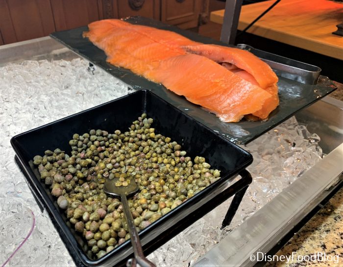 Still in the cold fish category, is the salmon. Now this one was certifiably fresh and had all the toppings you’d need — red onion, capers, hard-boiled eggs. This is the sort of item that really elevates Akershus from other character meals on property. Typically you don’t associate fresh salmon with this category of dining, but we are in Norway after all!