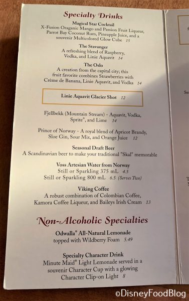 But first things first, DRINKS! Akershus has a wide variety of beer, wine, and specialty cocktails, as well as a few non-alcoholic specials. (Note you can even get Norwegian water! How’s that for authentic?!)