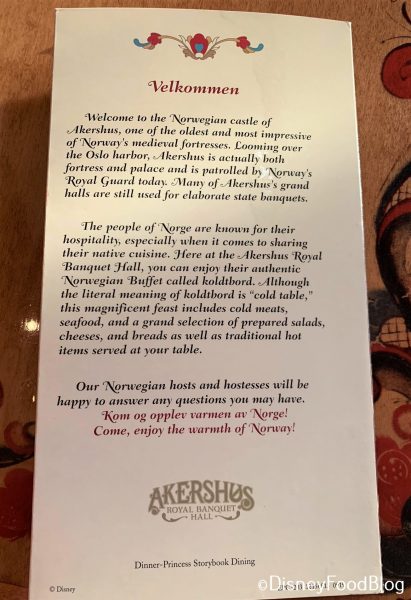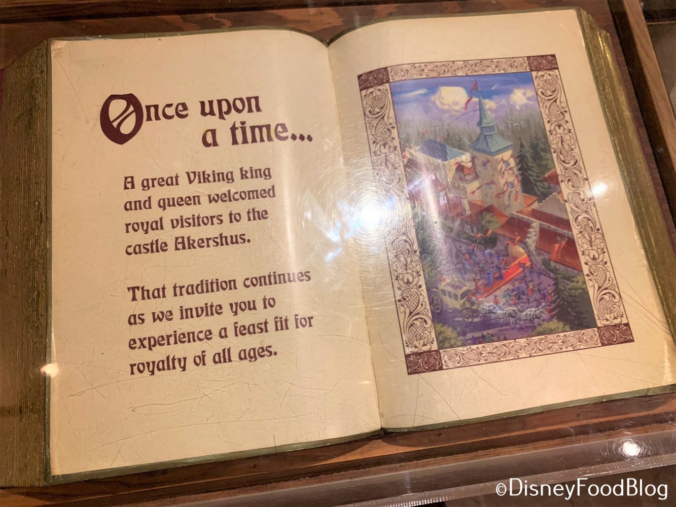 Like we’ve said, Akershus is located in Epcot’s Norway Pavilion, and is themed to be an old castle. In fact, upon entry, you can read this giant storybook explaining the Castle’s heritage.