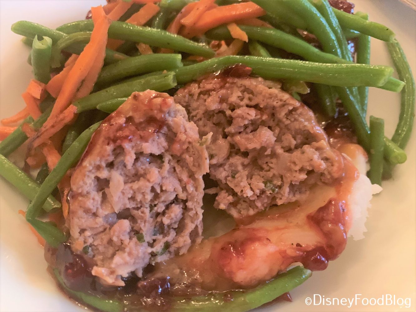 The meatballs are served with Mashed Potatoes, Seasonal Vegetables (green beans and carrots in our case), and Lingonberry Sauce.