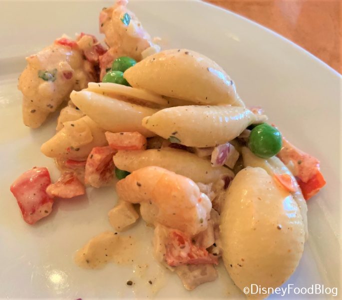 Possibly our fave of all the cold salads was the shrimp salad! It’s a mixture of big pasta shells, cold baby shrimp, peppers, onions, and peas, all tossed in a creamy sauce. Color us surprised, we’re normally not a big fan of cold seafood, but this one was very tasty! However the next cold seafood item, did not make a return visit to our plate…