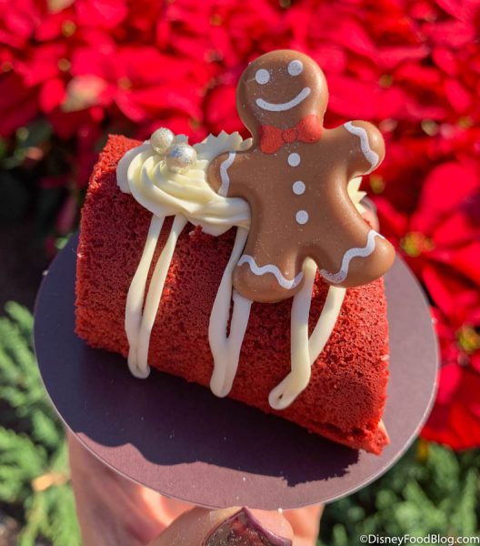 That’s right – this red velvet cake has a spiced cream-cheese filling and is topped with the cutest little gingerbread man (we mean, that bow tie?! C’mon!).