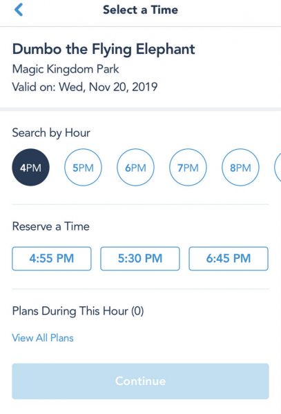 First, we noticed the FastPass search has changed. Before you could filter available FastPasses by morning, afternoon, and evening times. Now, you can search them by the hour — and FastPass times are also by the hour now, not half-hour as they had been previously!