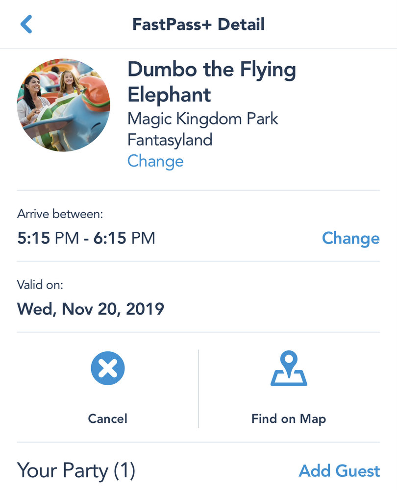 Then we noticed how you modify a FastPass has also changed. You can now select, “change” near the attraction to switch attractions or select “change” next to your arrival time to change the time. In the past, this was done on one screen, but the newly updated My Disney Experience has two separate screens now for these actions!