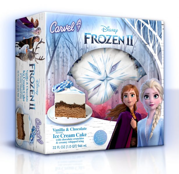 But, that’s not all! Carvel has also partnered with Rich Products and I Love Ice Cream Cakes to create a Frozen 2 Ice Cream Cake! The vanilla and chocolate ice cream cake comes with whipped icing, chocolate crunchies, and is topped with a gorgeous snowflake design! It’s available for $14.99 at many major national retailers, such as Walmart and Publix.