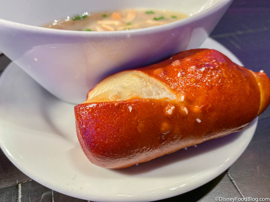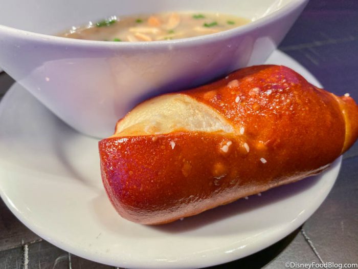 The pretzel roll is slightly salty on the outside, but beautifully soft on the inside. It’s a great side to dip in the soup as you snack!