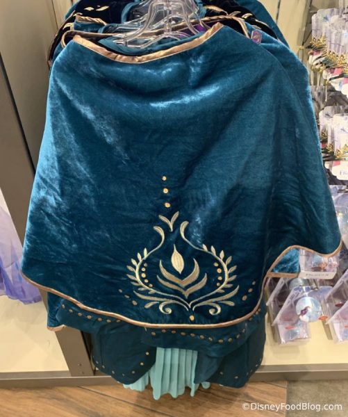 WHAT?? That’s right, these new costumes actually contains BIG spoilers for the ending of Frozen 2 (but we’re not going to tell you what those are 😉). Without seeing the movie, these dresses could be for any nicer occasion for Anna and Elsa. Anna’s is super formal, with a flowing dark turquoise velvet cape lined with her more traditional purple color.