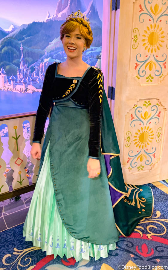 Yep, Queen Anna of Arendelle is now meeting her royal subjects at the Sommerhus complete with her new regal dark green dress, updo, and her crown (!!!).
