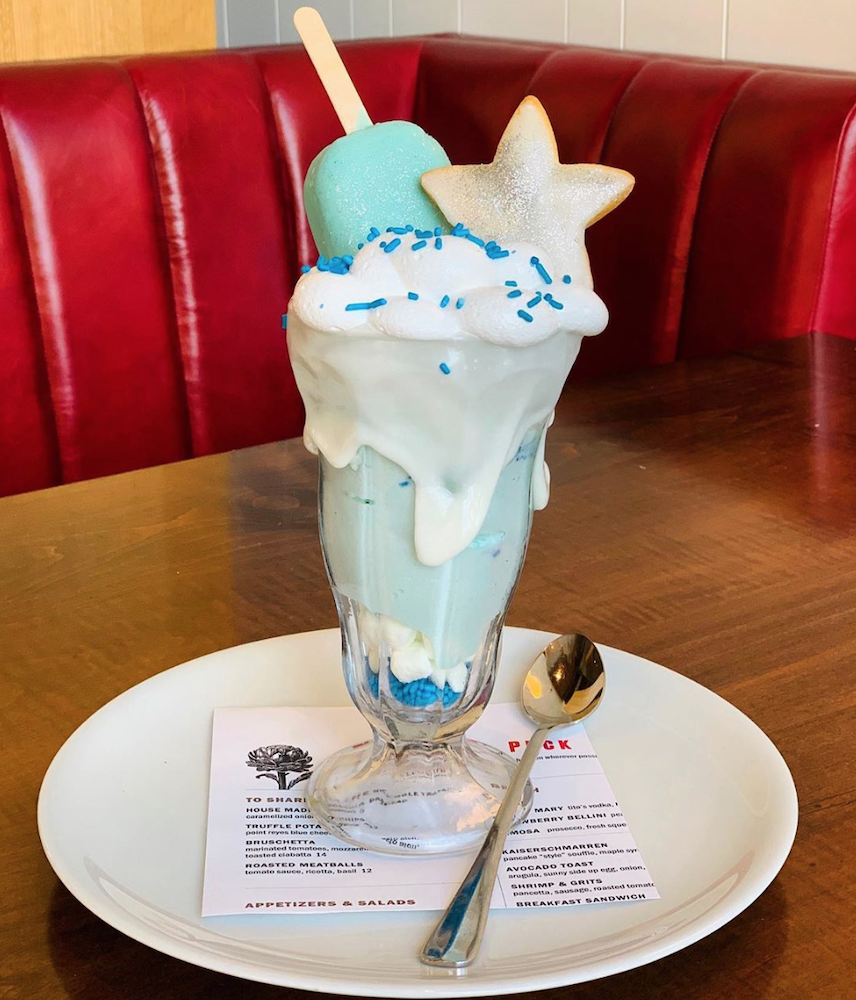 The frozen gelato sundae is mixed with sprinkles and mini marshmallows and then topped with marshmallow fluff, more sprinkles, a star sugar cookie, and a vanilla blackberry popsicle!