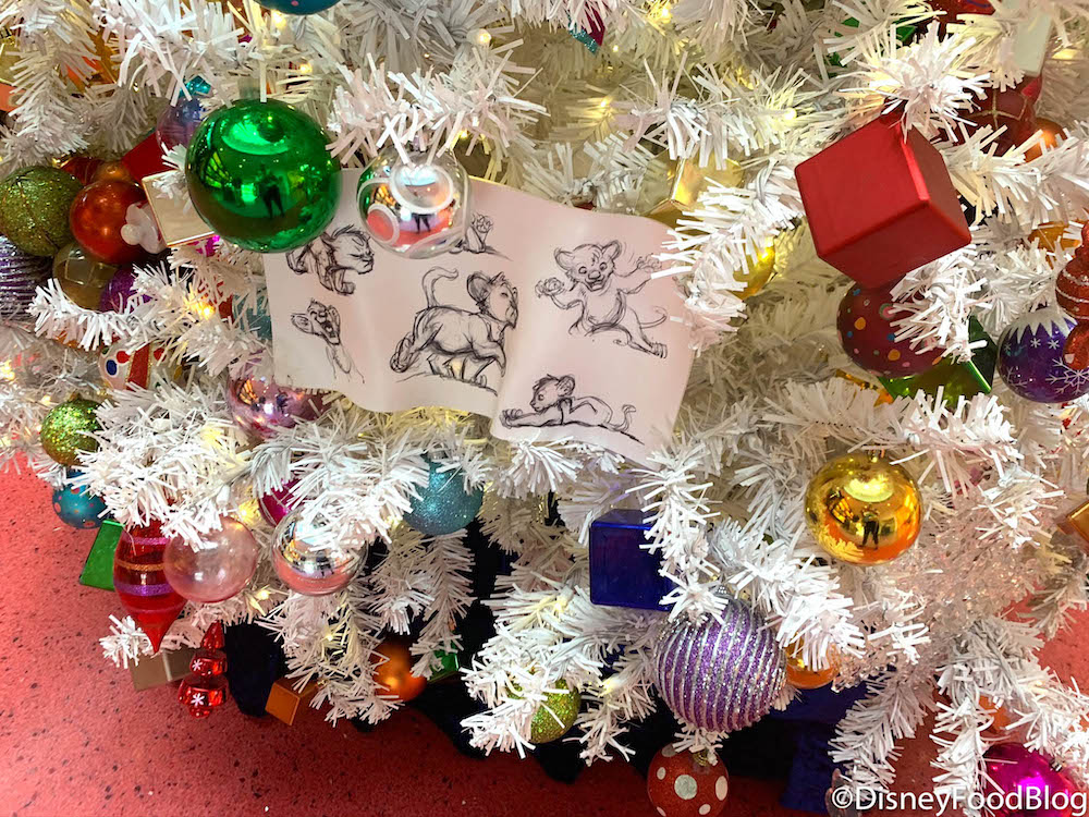 The tree features lights, ornaments, and artwork from different Disney films (like The Lion King!).