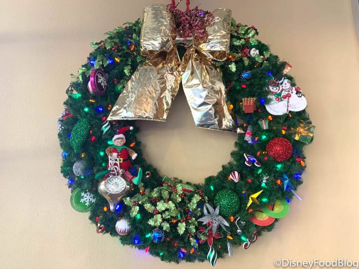 The wreaths around the lobby have the same design as the Christmas tree…