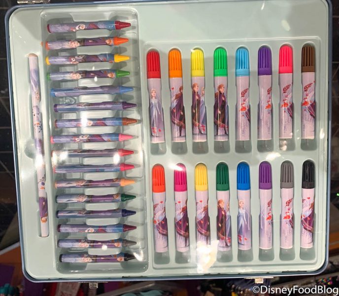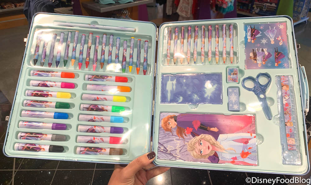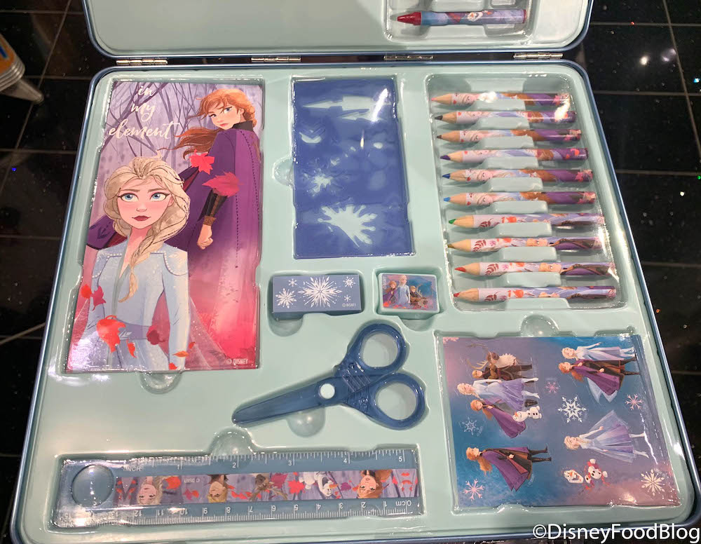 …and an entire array of art supplies on the inside! The Frozen 2 Art Kit includes an eraser, pencil sharpener, ruler, scissors…
