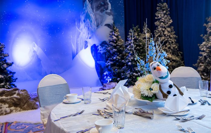 Offering events for large or small groups, the Frozen 2 concept includes “unique centerpieces, backdrops, and entertainment”, according to the official site. You can see a bit of inspiration for that below, including an Olaf centerpiece with beautiful icy-blue accents! The concept also allows you to work with Disney chefs to create a fabulous menu for any meal of the day. And, of course, you can sip on some yummy beverage and customized Frozen-inspired cocktails!