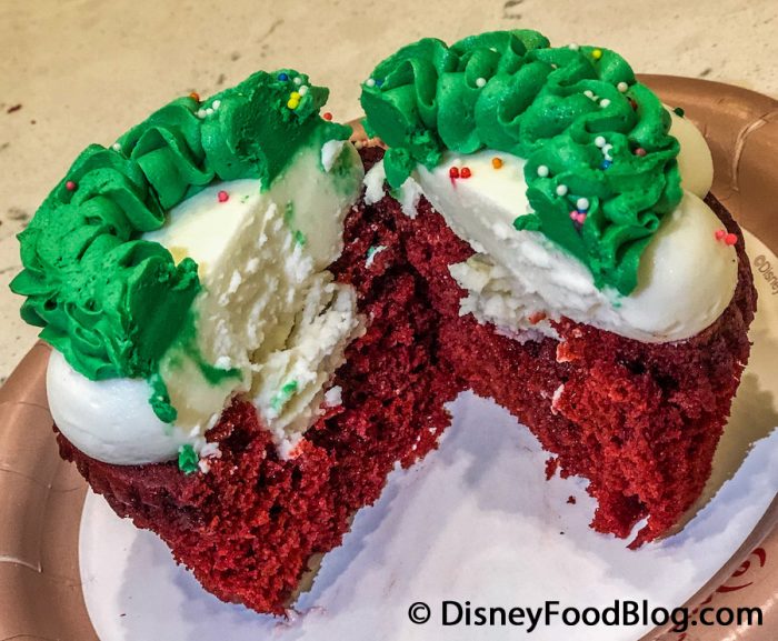 The green buttercream frosting, on the other hand, was delicious — as is usually the case with Disney cupcakes. We wish it would have had more of this tasty buttercream frosting and less of the cream cheese-based one. Hey, at least we weren’t entirely “bah, humbug” about this beautiful cupcake.
