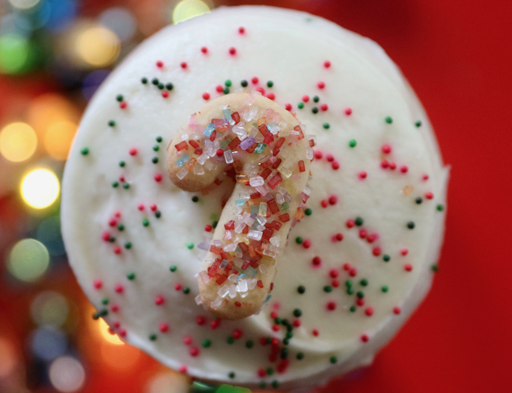 The vanilla cake is studded with red and green sprinkles and topped with vanilla buttercream, more festive sprinkles, and a homemade sugar cookie.