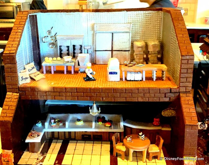 The fantastic display includes two large buildings — one’s a gorgeous view of Amorette’s Patisserie rendered fully in gingerbread from the outside, while the other structure shows what the shop looks like on the inside! We can spot a little baker making the pastries and cakes being sold in the store below! So cool!