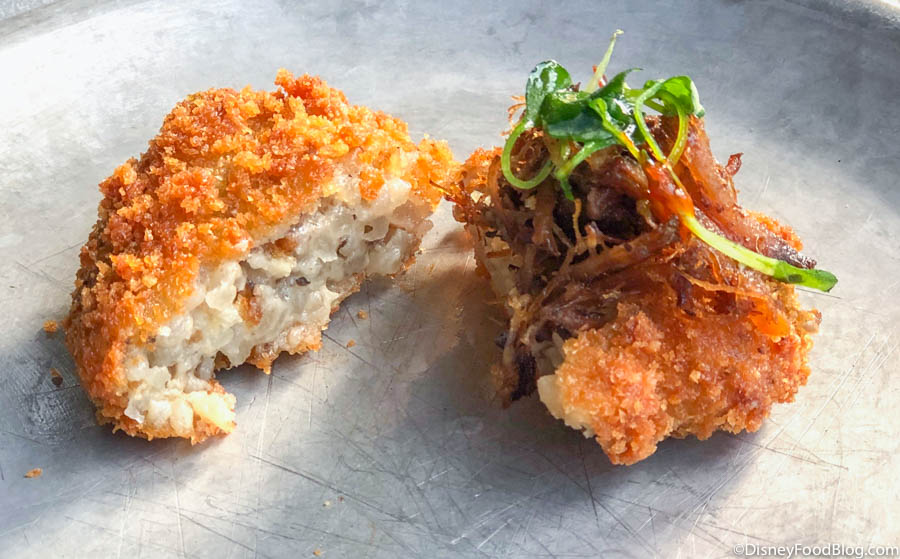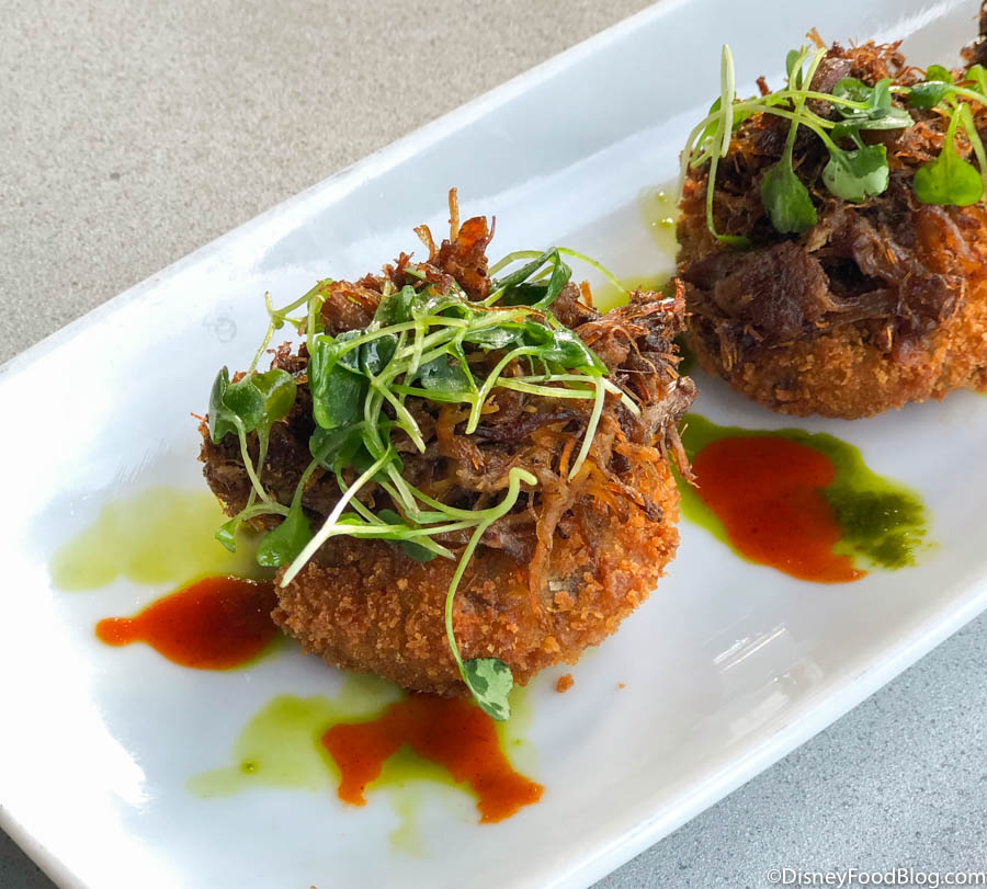 We never thought that braised lamb could taste SO GOOD. The Drummer Boy Braised Lamb is quite possibly one of the tastiest things we’ve EVER had at Disney Springs. The lamb is braised to a slightly crispy point, but it balances wonderfully with crunch from the fried arancini, Manchego, and mushrooms.