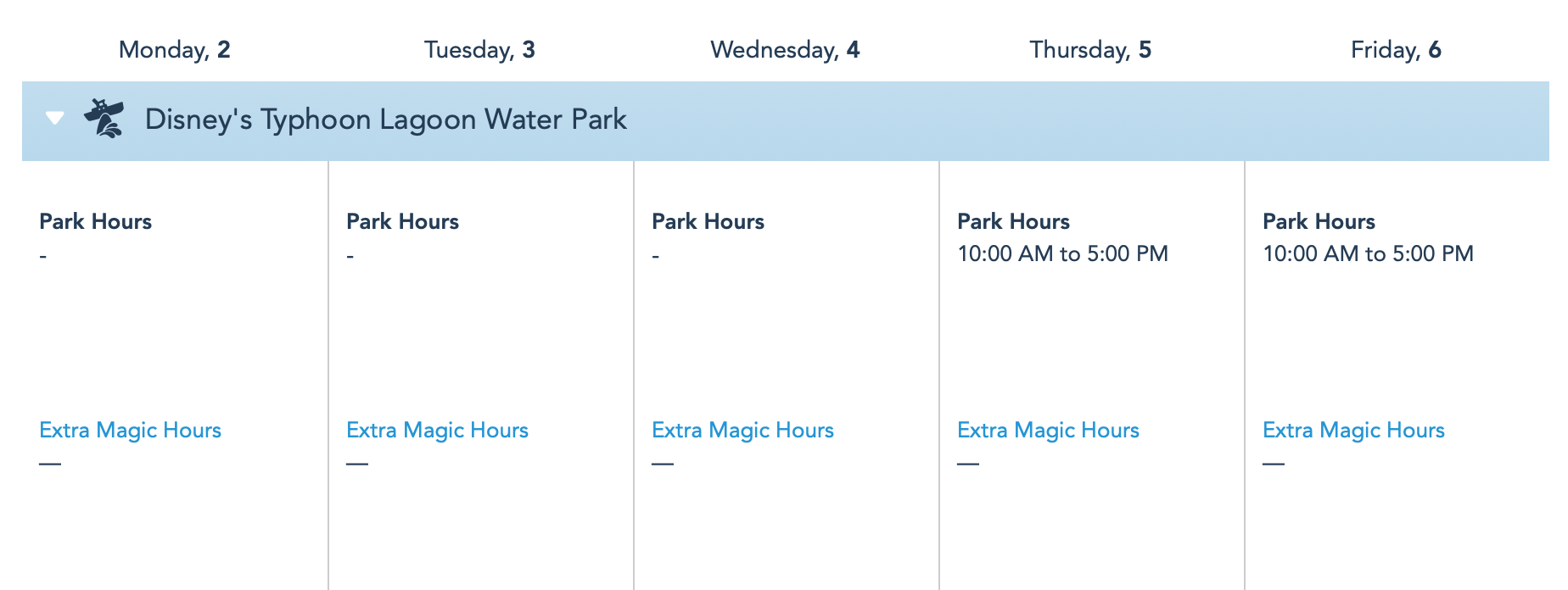 According to Disney’s calendar, it looks like Typhoon Lagoon will be back on its regular schedule starting December 5th, but we always recommend you keep an eye on it just in case anything changes!