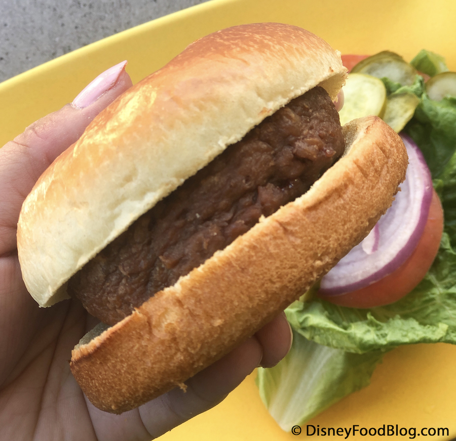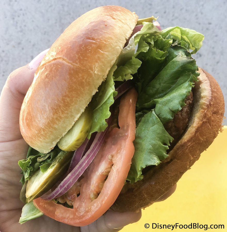 We did some digging and decided to speak to a Cast Member when we realized there was no information on exactly what type of plant-based burger patty we were about to consume! A Cast Member confirmed that it is a Beyond Meat patty. The Beyond Meat burger patty has no GMOs, soy, or gluten. It is perfect for plant-based foodies!