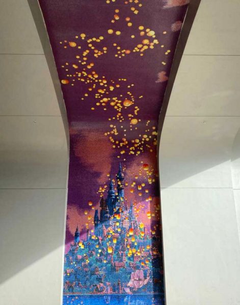 The Tangled mural features one of our favorite scenes from the movie! Just look at all those fabulous floating lanterns lighting up the night sky above the castle! They look just like the ones Rapunzel and Flynn Rider release over the water!