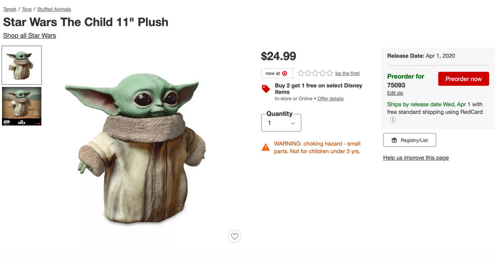Keep in mind these Baby Yoda toys will NOT arrive in time for Christmas! The earliest you’re looking at getting these little bbs home to you is SPRING 2020! But if you’re itchin’ for some Baby Yoda in your life, get movin’!