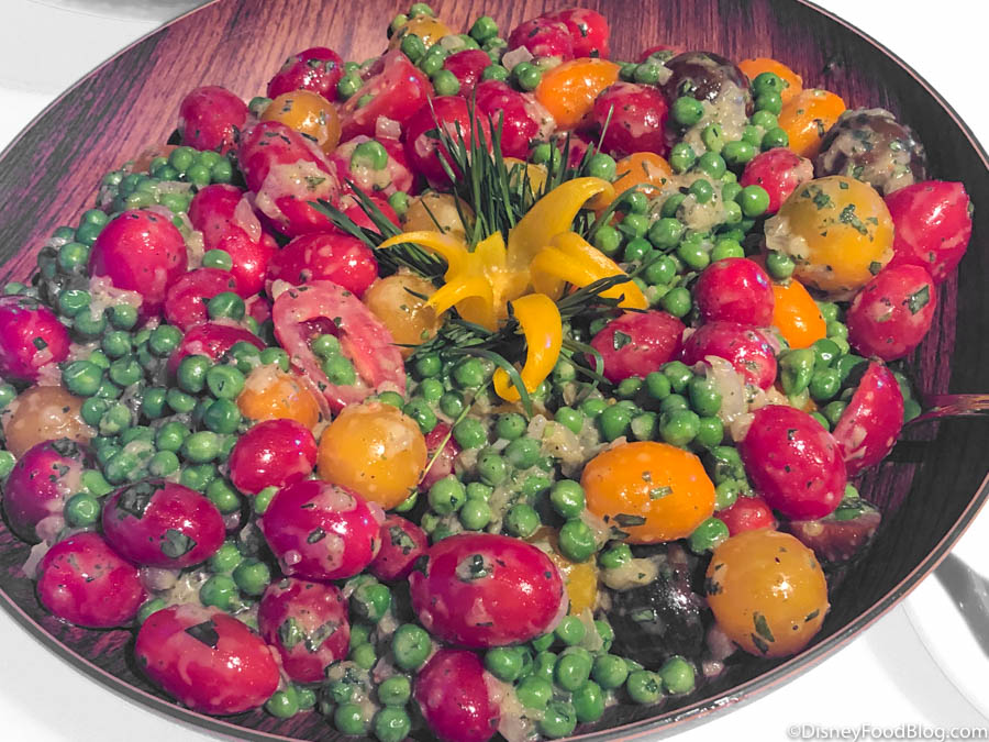 So, let’s talk about those eats!!!! We started off by trying the Toybox Tomato Salad which is a yummy and refreshing blend of peas, tomatoes, onions, and a basil vinaigrette.