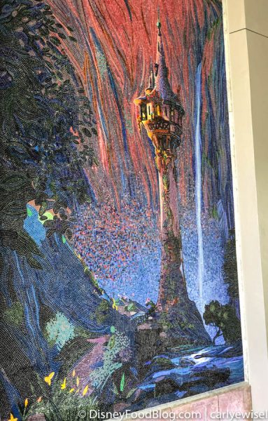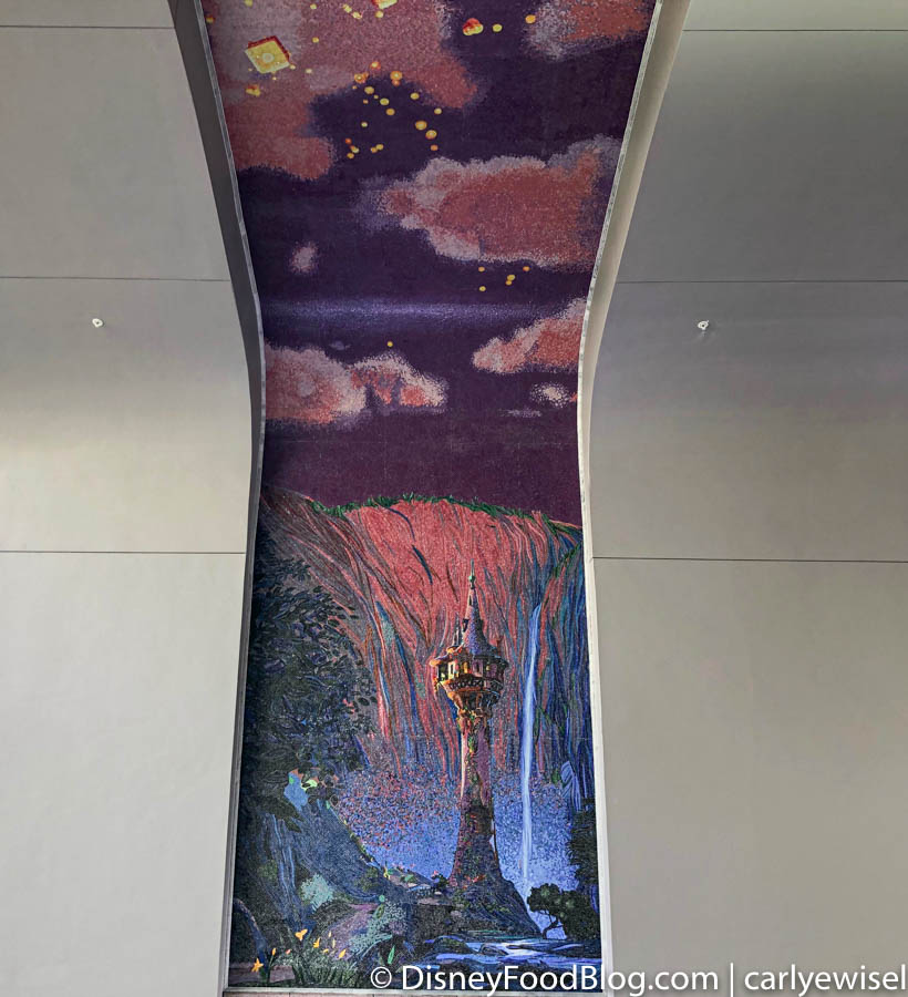 That’s right, remember those BEAUTIFUL mosaics we got to preview recently? They are actually located in the tunnel leading up to the Skyliner! This stunning mosaic takes inspiration from Tangled.