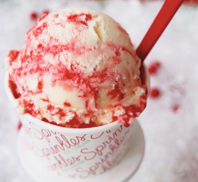 A new Candy Cane Ice Cream flavor has been added to the menu at Sprinkles — who are usually known for their wide variety of cupcakes, but from time to time they will offer specialty ice cream flavors as well!