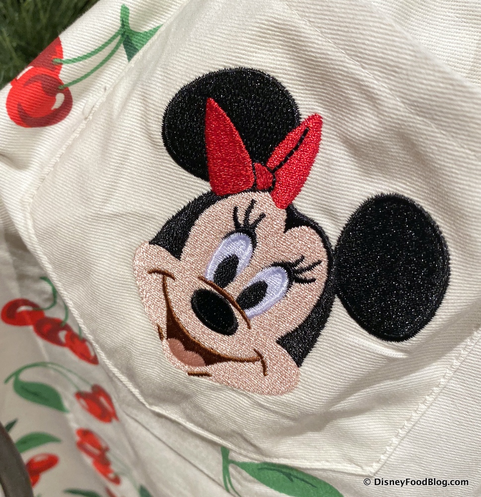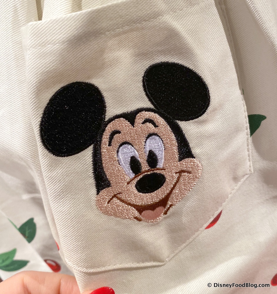 It’s truly the standout of the show! Just look at all those shiny red cherries printed all over its top and along the bottom. We think we see some hidden Mickeys… And it’s even got POCKETS! One pocket features our ol’ pal, Mickey Mouse!