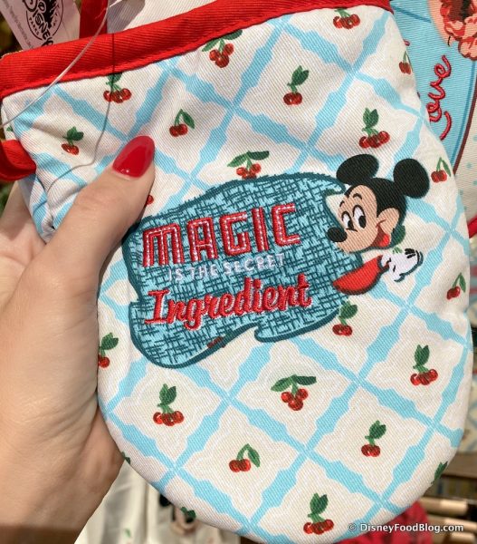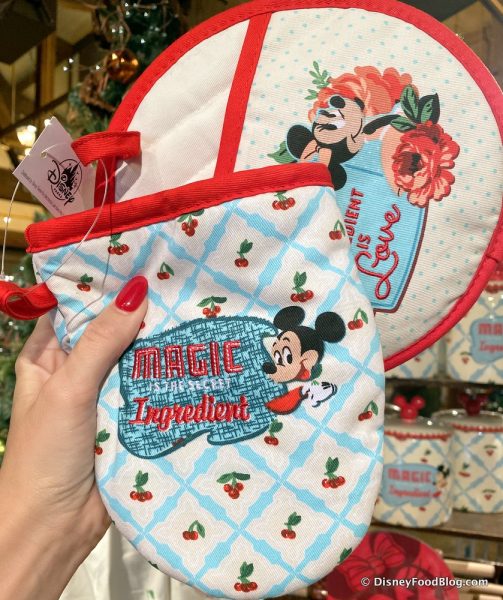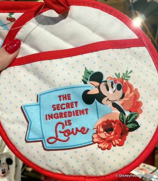 While the Minnie pot holder is round and says, “The Secret Ingredient is Love”. Well, whatever the ingredients may be, we know the secret recipe behind this collection is simply fabulous!