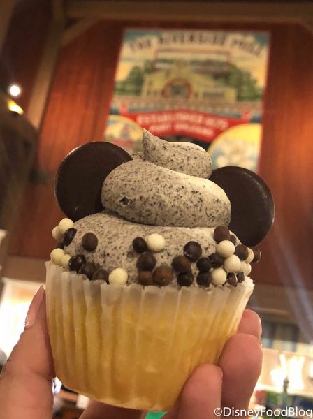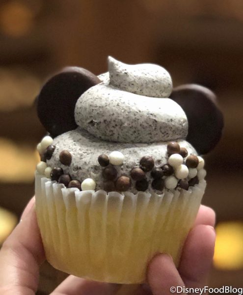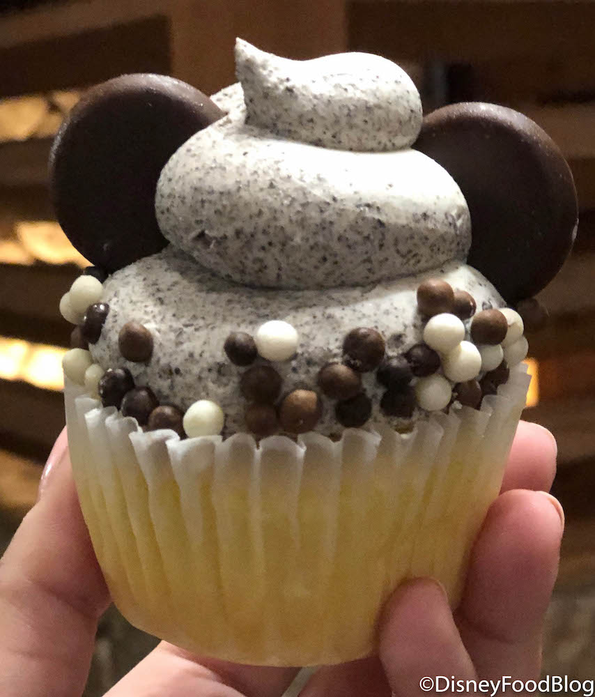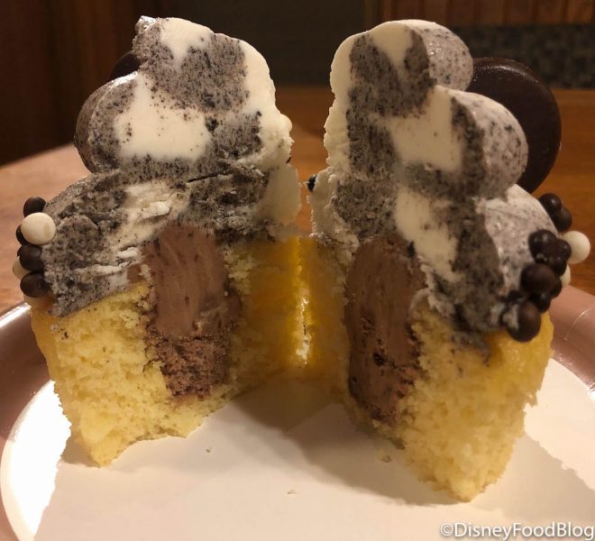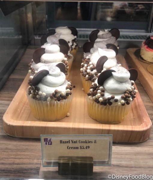 The Hazelnut Cookies & Cream cupcake — complete with Mickey ears — is described as a Vanilla Cupcake, filled with Nutella Buttercream (!!!), and topped with Oreo Cookies & Cream Buttercream.