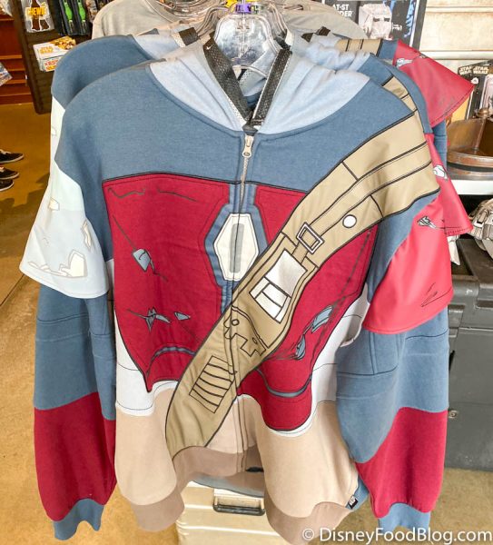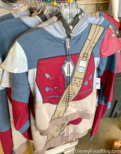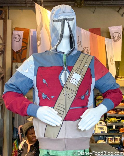 We spotted this NEW Mandalorian Bounty Hunter Sweatshirt at Star Wars Galactic Outpost in Disney Springs and it’s the coolest thing we’ve seen all day. The zip-up sweartshirt actually zips all the way up, so you can have your own Mandalorian mask (don’t worry, the hoodie includes a mesh mask so you can still see!).