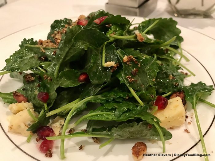 The first course is a Salad that features Baby Kale, Quinoa, Pomegranate seeds, Stilton Cheese, Candied pecans, and White Balsamic Vinaigrette.