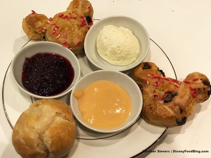 The Traditional Scones are served with a Citrus Cranberry Curd (in place of the usual lemon), Devonshire Cream, and Strawberry Marmalade. The Mickey-shaped scones get a holiday overlay with the addition of red and white candy cane sprinkles.