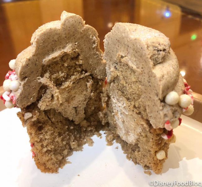 Before we even dug into the cupcake, the smell of the ginger was extremely aromatic (and made us super excited to try it). The spiced vanilla cake has just a hint of heat, while the buttercream carries most of the AH-MAZING ginger flavor. The white chocolate crispies and peppermint sprinkles add a bit of sweetness and crunch to the treat, making it every gingerbread fan’s holiday dream come true!