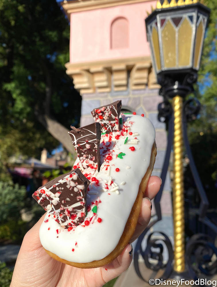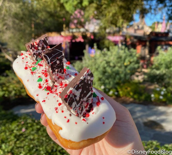 The yeast donut is fluffy and practically melts when you bite into it (we’ll take 3). While the vanilla icing and sprinkles on top are pretty much a norm for a donut in Disneyland, the thick pieces of chocolate peppermint bark are SO GOOD.