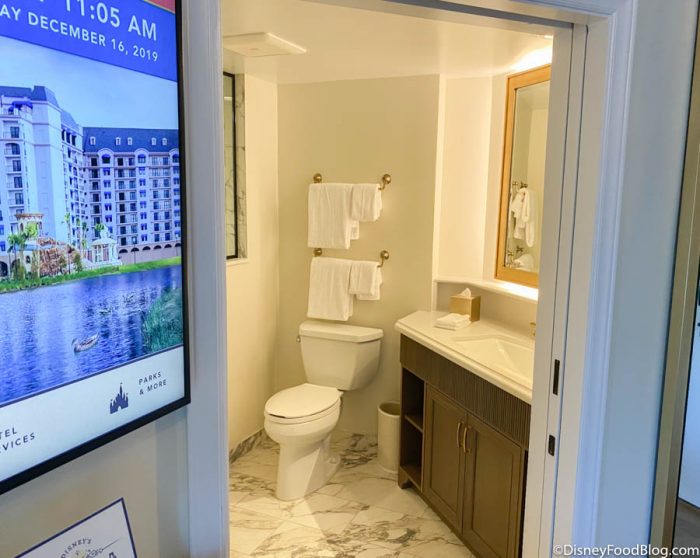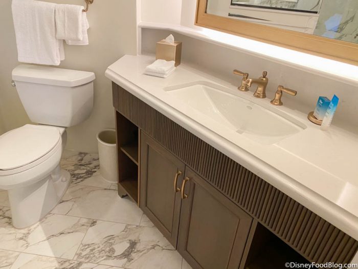 The bathroom at the other side of the room has a vanity that’s big enough for BOTH people in the room…