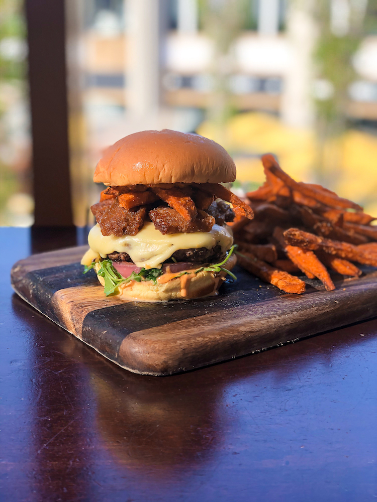 The holiday burger is stacked with Angus beef, candied pork belly, arugula, pickled red onion, sriracha honey aioli, and sweet potato fries AND served with more fries for $20!