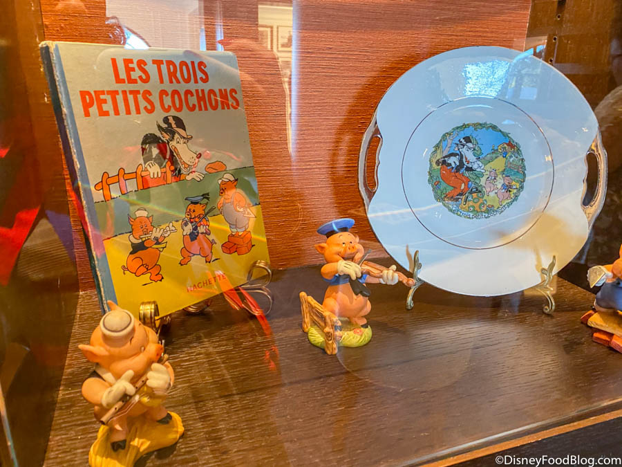 There are also lots of interesting artifacts and pieces of Disneyana — that’s just a fancy word for old-timey Disney stuff! We saw this display case containing some interesting Three Little Pigs items which debuted in 1933.